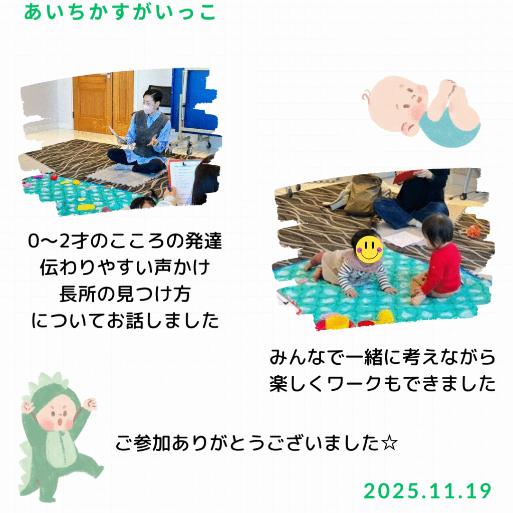 急に寒くなり、季節柄体調を崩しやすい時なので、体調不良のためお休みの方もいらっしゃいましたが、9ヶ月から1才3ヶ月の子どもたちとママそして妊婦さんも参加してくださいました😊
