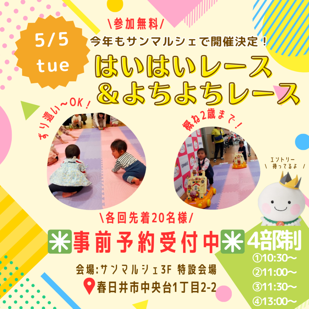今年も、5月5日(火・祝)高蔵寺のサンマルシェにてネピア杯はいはいレース&よちよちレースの開催が決定しました!!※参加無料
