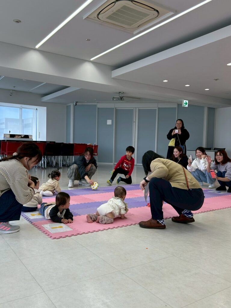 ママの文化祭実行委員のふれあい広場チームと一緒に、はいはい&よちよちレース、ママのおしり歩きレースをしました。